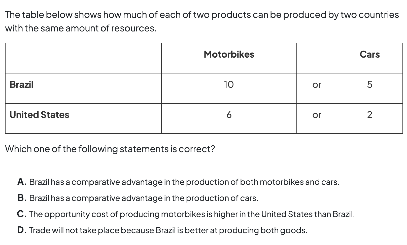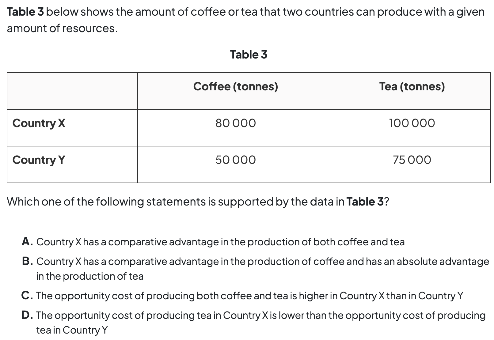 - countries will have a comparative advantage in the goods or services with the lowest opportunity cost to produce.