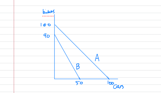 - the diagram shows an example of country A and country B who are able to produce cars and bikes.