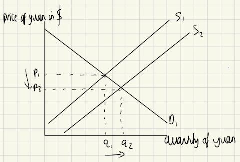 For example, China may prefer a weak currency so that it makes their exports cheaper and therefore more attractive, to achieve high aggregate demand and high economic growth. If their currency rises, they could use their reserves in order to devalue their currency. They would sell their reserves of Chinese Yuan and buy more US dollars. The diagram shows the value of the Chinese Yuan will fall as a result of this increase in supply, which will make their exports cheaper.